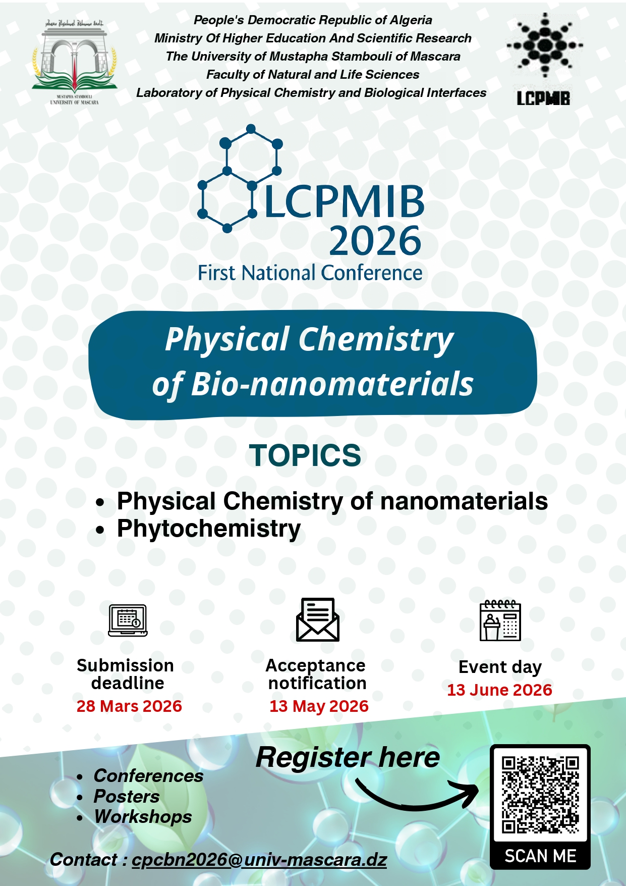The LCPMIB is thrilled to organize the first national conference on physical chemistry of bio-nanomaterials, featuring the following topics : • Physical chemistry of nanomaterials This topic addresses the synthesis and the characterization of nanosystems (natural and synthetic polymeric nanoparticles, dendrimers, magnetic nanoparticles, lipos